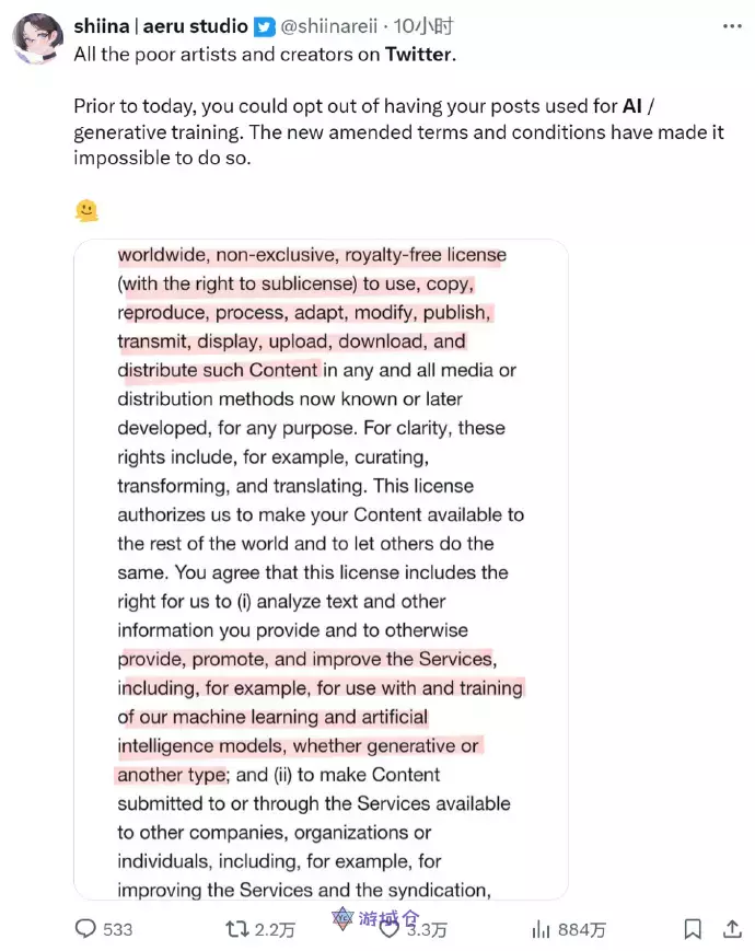 推特(X)近日更新了其服务使用条款,明确指出用户发布的文字和图片将用于AI模型的训练。这一变更引发了一些用户的担忧,尤其是那些经常在平台上分享原创艺术作品的创作者/画师。目前已经有大量画师决定删除自己在推特上的作品并考虑转战其他平台。